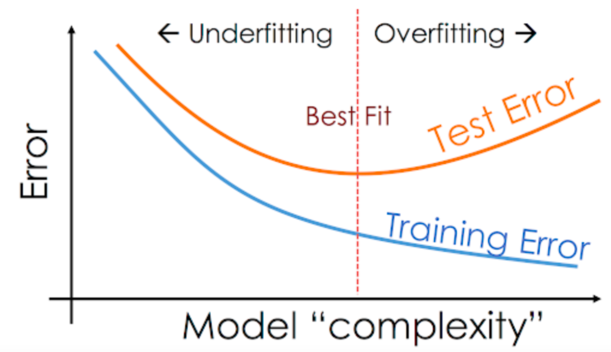 위의 그림 4 와 같이 모델 복잡도와 손실함수에 따라 과소적합과 과대적합이 발생하는 구간을 확인할 수 있습니다. 여기서 Error는 모델 학습에 있어서 궁극적인 목푯값인 손실함수✅를 의미합니다. 여기서 x축은 모델의 복잡도이며 단순히 epoch 수가 아니라는 점 기억해 주세요!