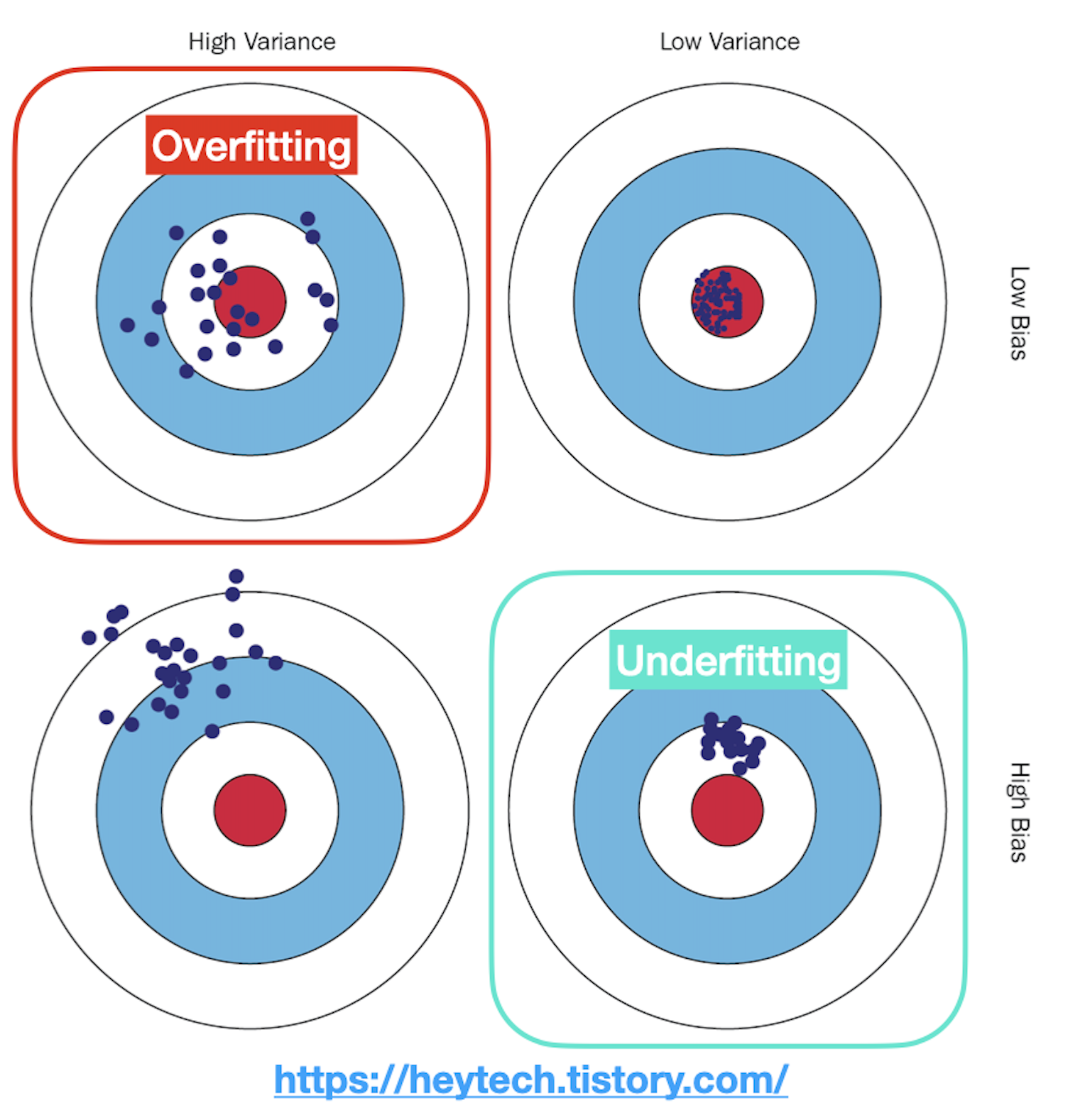 아래 그림 2 를 통해 과대적합과 과소적합을 더욱 직관적으로 이해해 보죠. 분산(variance)✅과 편향(bias)✅에 따라, 즉 2X2개의 둥근 과녁이 있습니다. 과녁마다 빨간색 원이 target이고 파란색 작은 점이 하나의 데이터를 의미합니다.
