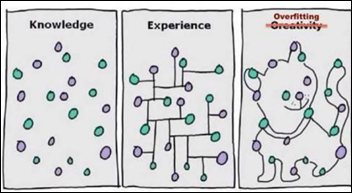 아래 그림 1 내 좌측 그림 과 같이 어떤 지식/데이터가 주어졌다고 가정해 보겠습니다. 그림 1 내 가운데 그림 과 같이 경험적으로 어떤 관계/구조가 있다고 할 수 있습니다. 하지만, 만일 그림 1 내 우측 그림 과 같이 주어진 데이터를 특정한 조건/구조를 지나치게 반영하면 고양이나 강아지 그림이라고 창의적으로(creatively) 판단할 수도 있게 만듭니다. 이처럼 데이터셋의 특정 조건이나 구조를 과도하게 최적화하면 과대적합이 발생하게 됩니다.