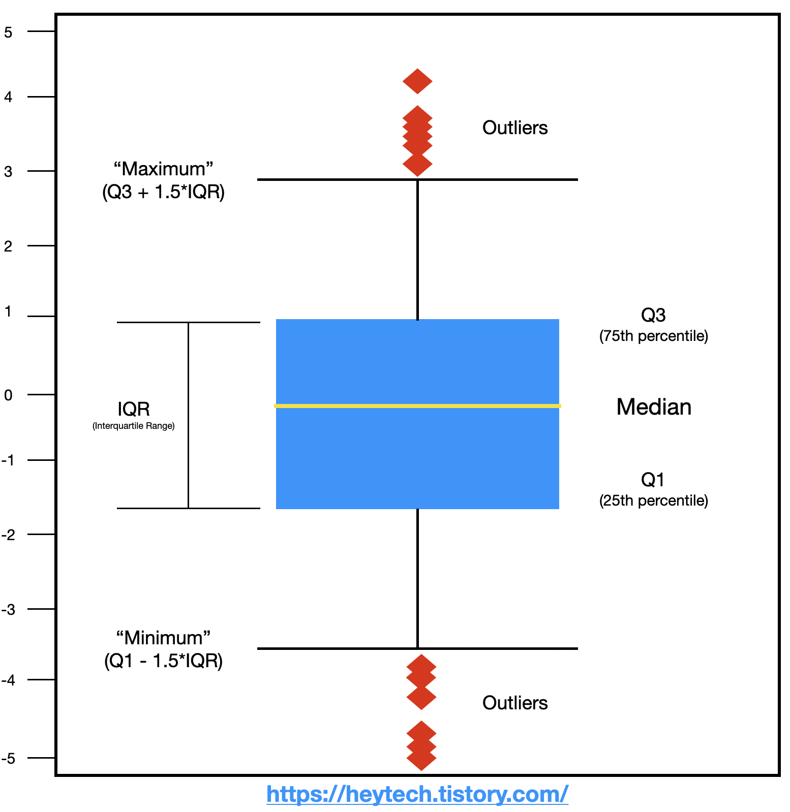 Boxplot의 수염에 해당하는 박스 바깥의 위, 아래에 가로로 긴 직선을 각각 Maximum, Minimum이라고 부릅니다. Maximum은 IQR 값에 1.5를 곱한 값에 Q3을 더한 값이고, Minimum은 Q1에서 IQR 값에 1.5를 곱한 값을 뺀 값입니다. 이상치는 이 Minimum과 Maximum 보다 각각 크거나 작은 값으로 극단치라고 부릅니다. 즉, 그림 4에서는 빨간색 다이아몬드가 모두 이상치에 해당하는 것입니다.