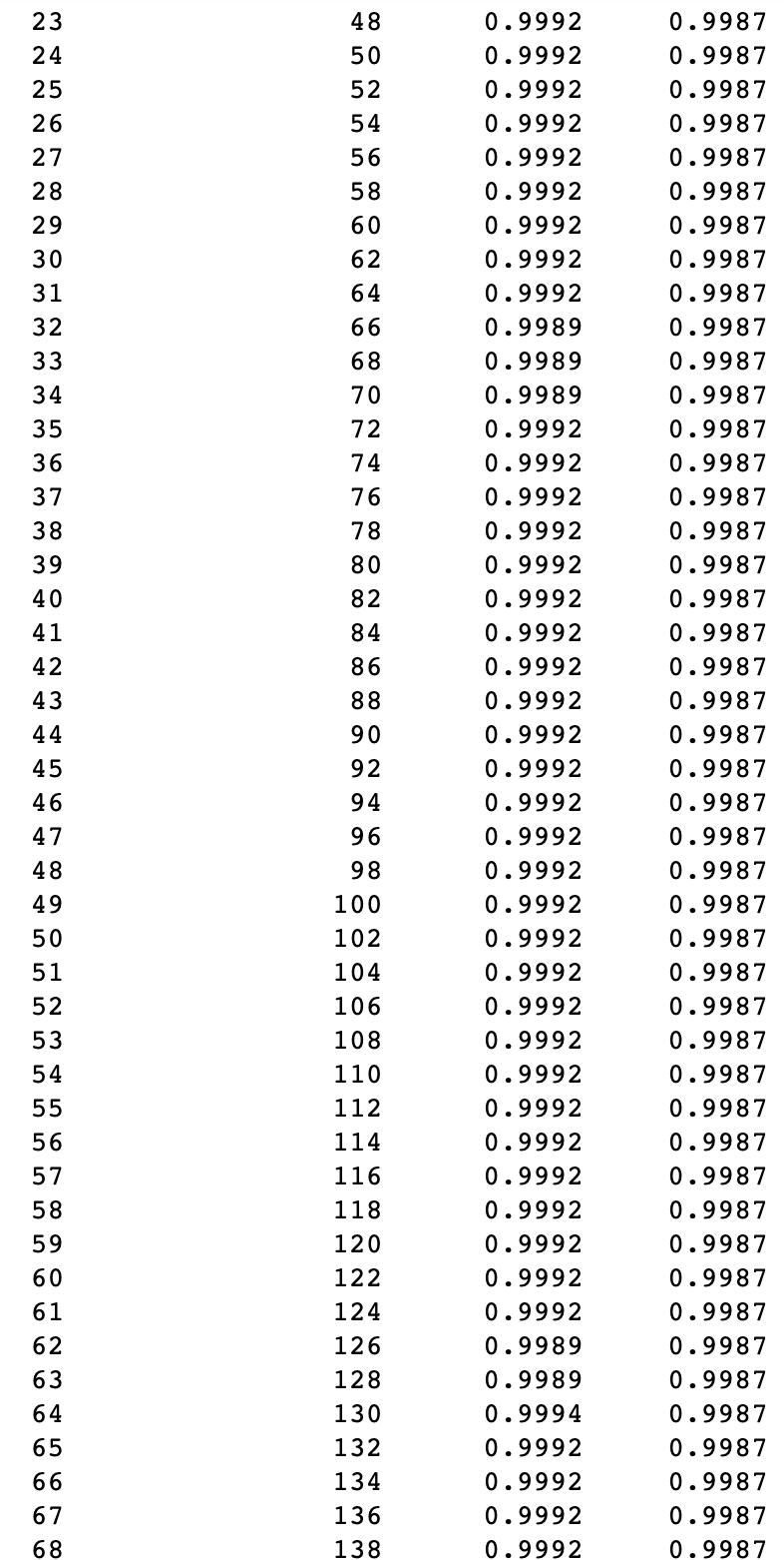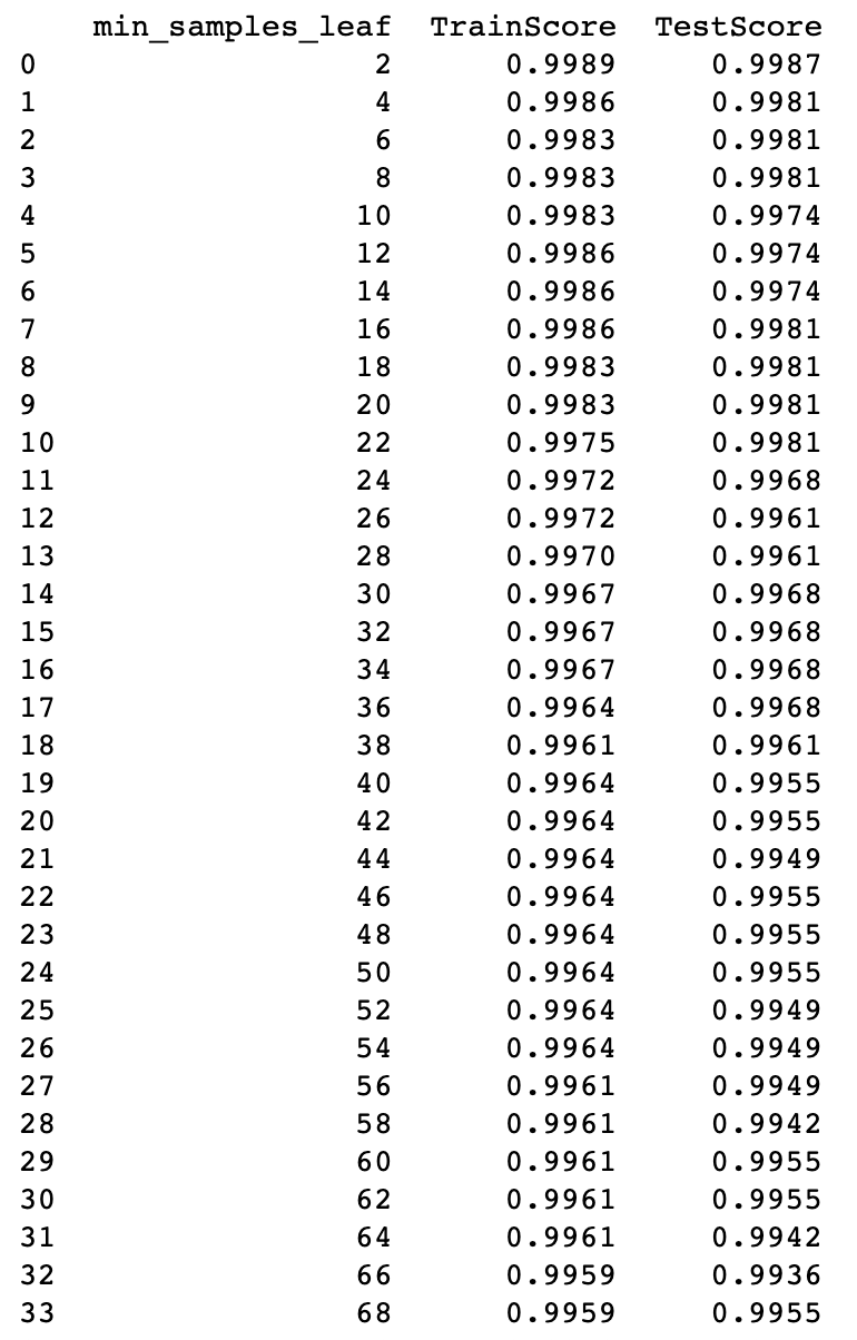 아래 그림 15와 같이 잎사귀 노드의 최소 자료 수에 따른 모델 성능 추이를 데이터프레임 형태로 출력해 봤습니다.