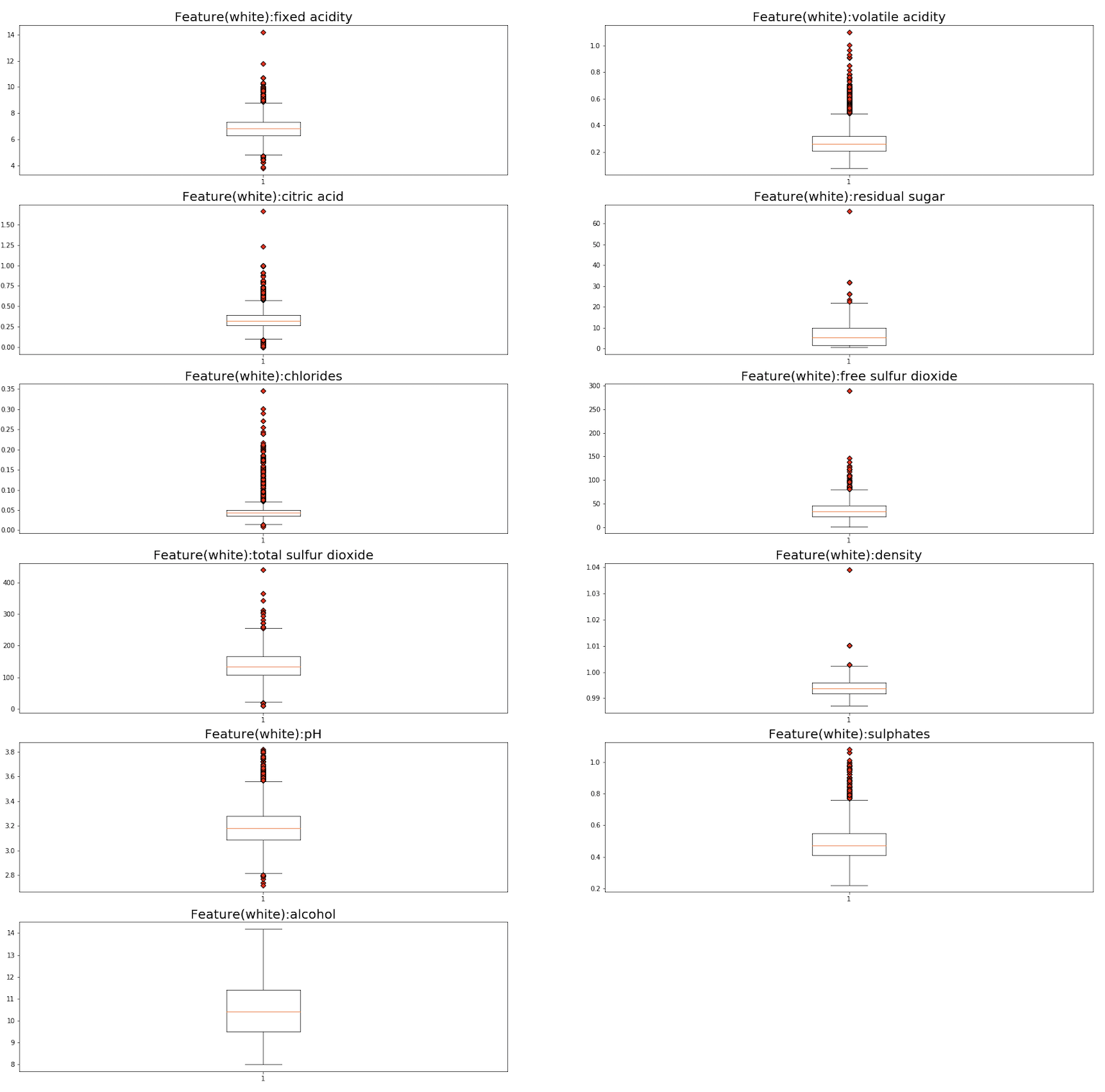 이제 다시 본론으로 돌아와, 레드 와인 데이터부터 이상치를 시각화해 보겠습니다.