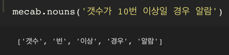 mecab.nouns('갯수가 10번 이상인 경우일 경우 알람')