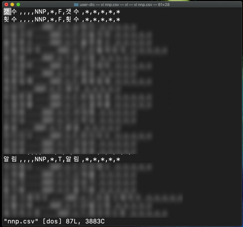 터미널을 통해 고유명사 사전이 있는 user-dic 폴더에 접근하신 후, 텍스트 편집기를 통해 고유명사 사전을 열어줍니다.
