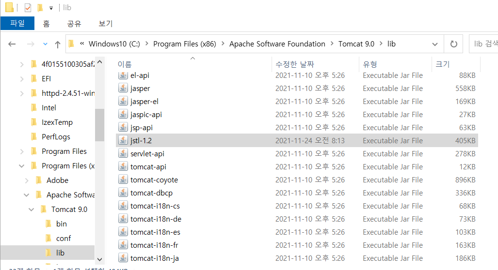 ์์ ์ค์นํ JSTL jar ํ์ผ์ tomcat ํด๋ > lib ํด๋ ๋ด๋ถ๋ก ์ด๋์ํต๋๋ค.