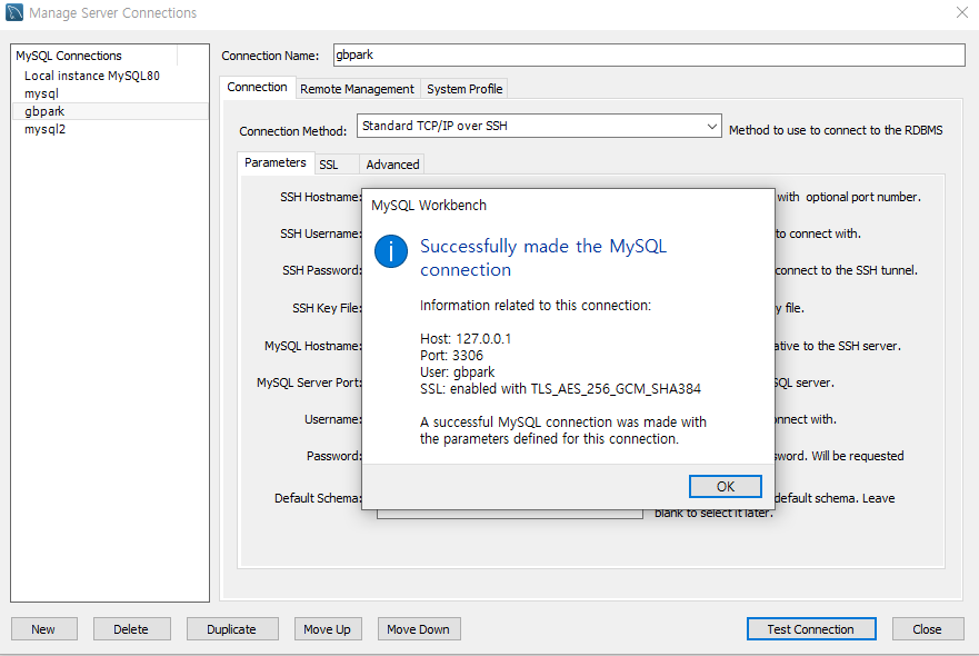 - Connection Method: Standard TCP/IP over SSH ์ ํ