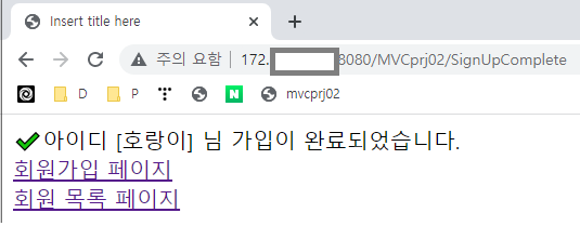 ๋ฉ์์ง ์ถ๋ ฅ ํ์ด์ง์ธ SignUpComplete.jsp๋ก ์ ๋์ด๊ฐ์ต๋๋ค.