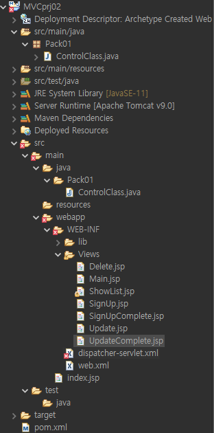 ์ ๋ MVCprj02๋ผ๋ ์ด๋ฆ์ผ๋ก ํ๋ก์ ํธ๋ฅผ ์์ฑํ์๊ณ ๋ค์๊ณผ ๊ฐ์ด ํ์ผ์ ๊ตฌ์ฑํ์์ต๋๋ค.