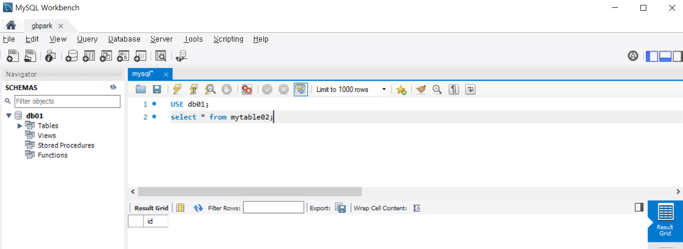 ๊ฐ์ ๋จธ์ ์์ ์์ฑํ ๋ฐ์ดํฐ๋ฒ ์ด์ค db01 ๋ด mytable02 ํ ์ด๋ธ์ ์กฐํํด ๋ด ๋๋ค.