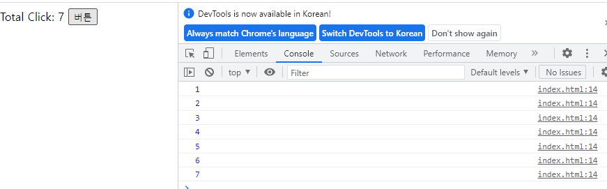 ์๋์ ๊ฐ์ด ๋ฒํผ์ ํด๋ฆญํ๋ฉด ์น ํ์ด์ง ๋ฐ ์ฝ์์ ํด๋ฆญ ํ์๊ฐ ์ถ๋ ฅ๋๋ ๊ฒ์ ํ์ธํ ์ ์์ต๋๋ค.