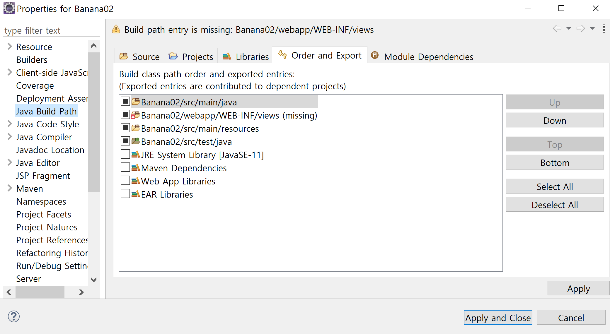 1) 좌측 메뉴바에서 Java Build Path 접근