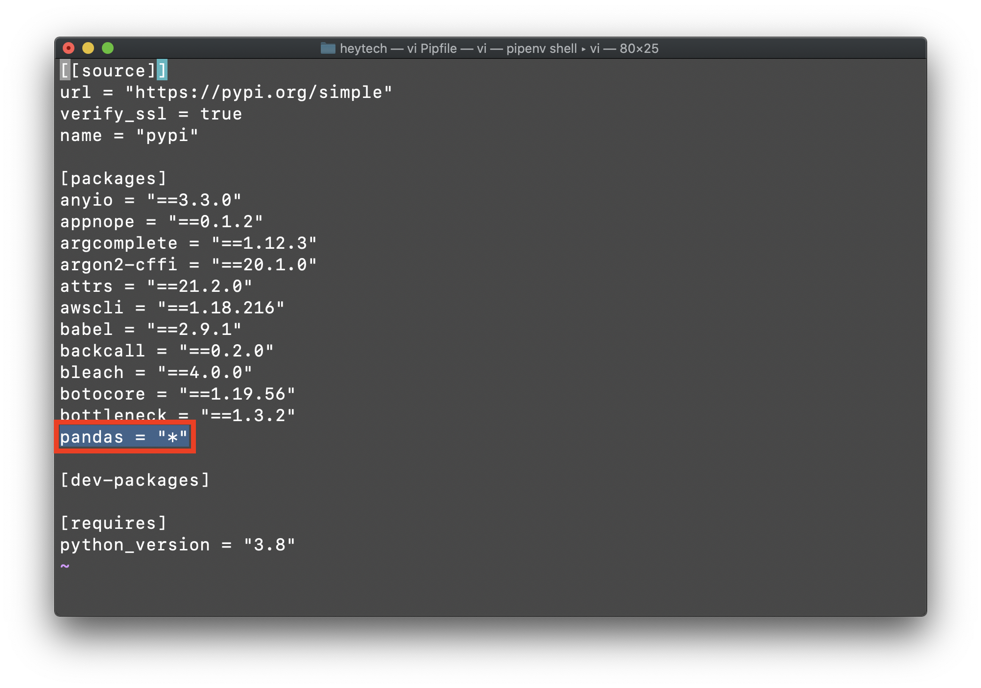 pipenv๋ฅผ ํตํด ํจํค์ง๋ฅผ ์ค์นํ ํ, Pipfile์ ์ด์ด๋ณด์๋ฉด packages ๋ฆฌ์คํธ์ ์๋ก์ด ํจํค์ง๊ฐ ์ค์น๋ ๊ฒ์ ํ์ธํ์ค ์ ์์ต๋๋ค.