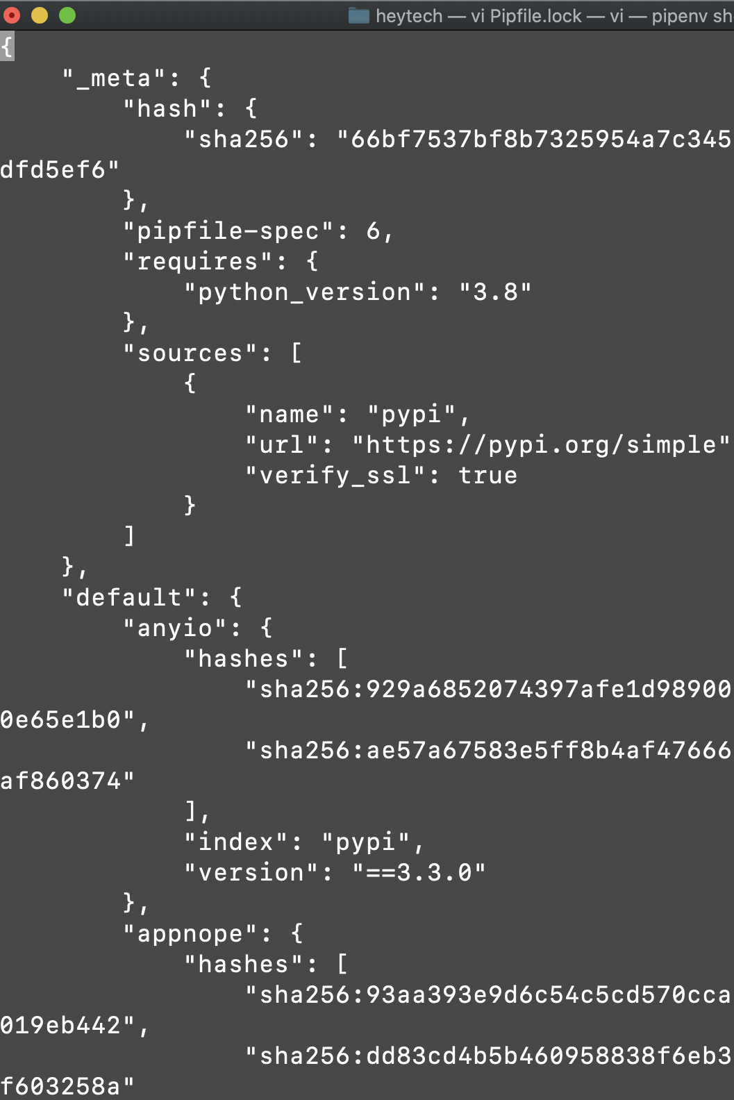 ํจํค์ง๋ฅผ ์๋กญ๊ฒ ์ค์นํ๋ฉด ์๋์ ๊ฐ์ด Pipfile.lock์ด ์๋์ผ๋ก ์์ฑ๋ฉ๋๋ค.
