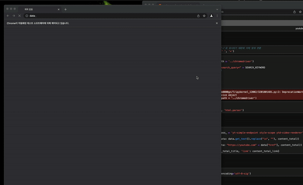 크롬 드라이버를 변수에 할당하고, 유튜브 웹 페이지에서 키워드 검색 시 활용하는 URL 구조와 검색어를 조합합니다. 드라이버로 조합한 URL에 접근합니다. 일정 시간 페이지 로딩이 지나면 무한 스크롤 함수를 실행합니다.
