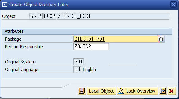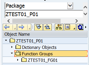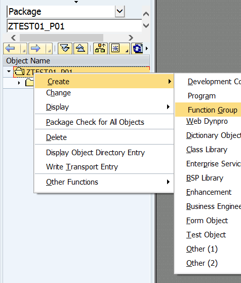 T-CODE SE80에서 패키지 이름 마우스 우측 클릭-Create-Function Group을 순차적으로 선택하여 Function Group 생성 창을 오픈합니다.