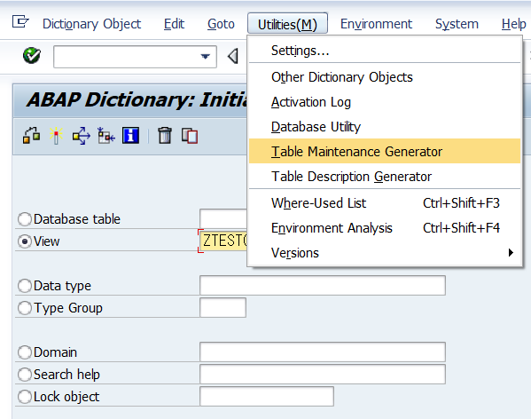 앞서 생성한 View를 선택하고, SAP 상단 메뉴에서 Utilities-Table Maintenance Generator를 선택합니다.
