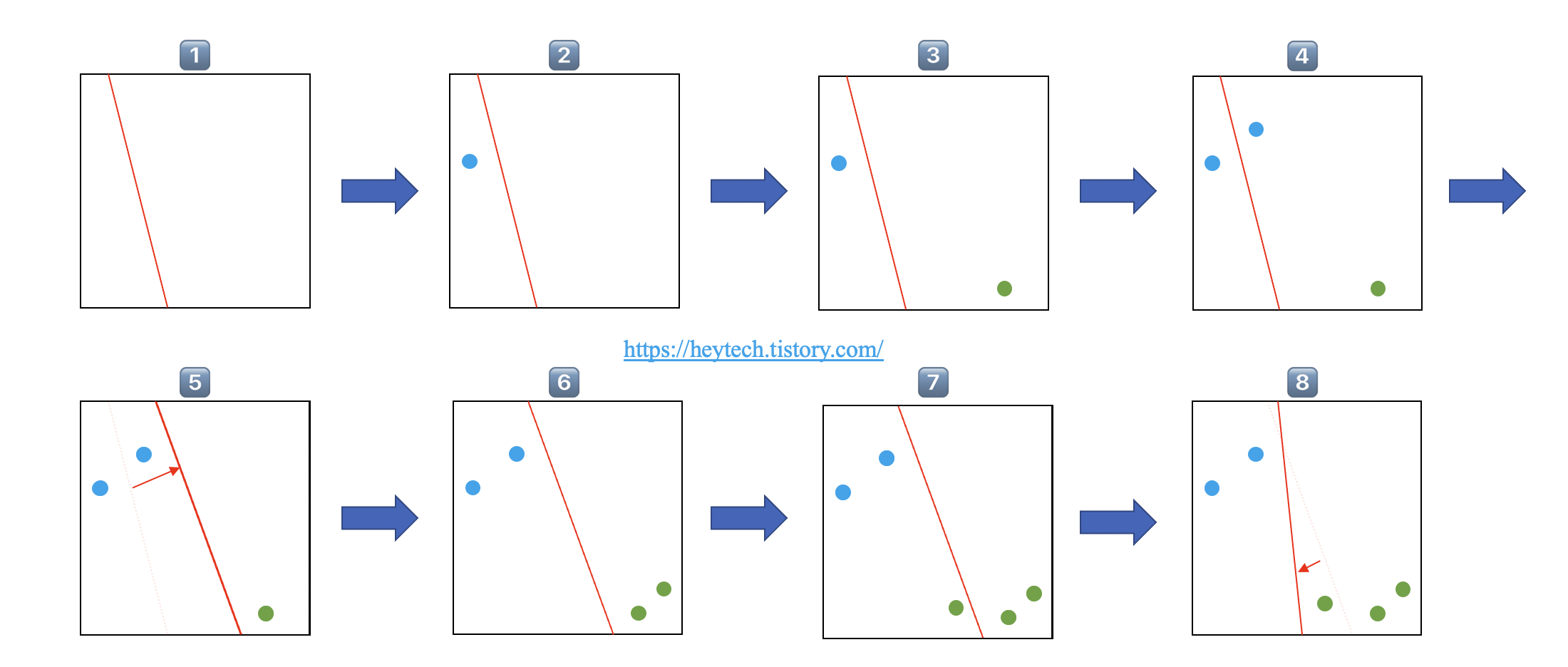 그림 3은 푸른색과 녹색 클래스 2개를 분류하는 퍼셉트론의 학습 절차입니다.