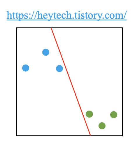퍼셉트론의 학습 절차를 알아보기 전에 퍼셉트론 개념에 대해 알아봅니다. 퍼셉트론은 이진 분류(Binary Classification) 모델을 학습하기 위한 지도학습(Supervised Learning) 기반의 알고리즘입니다. 이진분류란 예를 들어 인공지능(AI)에게 무작위로 동물 사진을 보여주었을 때 고양이 사진인지, 강아지 사진인지 분류하는 문제입니다. 여기서 고양이, 강아지와 같은 선택지를 클래스(Class)라고 부르고 선택지가 2개인 경우를 이진 분류라고 합니다. 수학적인 측면에서, 이진 분류는 아래 그림 1과 같이, 푸른색과 녹색 동그라미 2가지 클래스를 특정 기준 하에 구분하는 방법입니다. 그림 1에서는 두 클래스를 구분하는 기준은 붉은 직선이고, 이러한 기준(i.e., 여기선 직선)을 Decision Boundary라고 부릅니다.