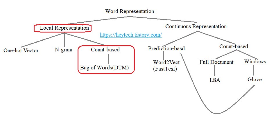 Bag of Words(BoW)는 단어를 수치화하는 방법 중 하나로, 문서 내 단어의 순서와 의미는 고려하지 않고 오직 출현 빈도(frequency)만 고려하여 단어를 표현하는 방법입니다. BoW는 국소 표현방법(Local Representation) 또는 이산 표현방법(Discrete Representation)의 일종으로 카운트 기반의 단어 표현방법(Count-based Word Representation)이라고 부릅니다(그림 1 참고).