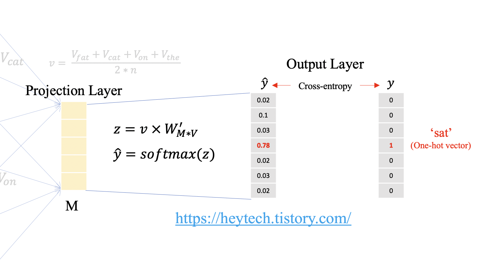 평균 벡터 \(v\)를 투사층과 출력층 사이의 가중치 행렬 \(W^{'}\)과 곱합니다. 곱셈 결과로 얻어진 벡터를 \(z\)라 할 때, \(z\)는 입력층의 원-핫 벡터와 같은 차원이자 단어 집합의 크기인 \(V\)를 갖습니다(그림 7). \(z\) 벡터가 소프트맥스(softmax) 함수를 거치면 벡터 내 각 원소는 \(0\)과 \(1\) 사이의 실숫값을 갖고 모든 원소의 합은 \(1\)이 되는 스코어 벡터(score vector) \(\hat{y}\)를 얻을 수 있습니다. 스코어 벡터 내 각 원소의 값은 해당 단어가 중심 단어일 확률을 의미합니다. CBOW의 목표는 레이블 된(labeled) 중심 단어의 원-핫 벡터인 \(y\)와 스코어 벡터 \(\hat{y}\) 간의 오차를 최소화하는 것입니다. CBOW는 두 벡터의 차이를 계산하기 위해 손실함수(loss function)로써 크로스 엔트로피(Cross-entropy)를 사용합니다. 손실함수의 수식은 아래와 같습니다.
