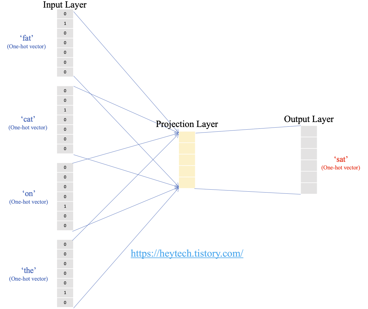 CBOW의 인공신경망(Artificial Neural Network, ANN)을 도식화하면 위의 그림 3과 같습니다. 입력층(input layer)에는 사용자가 지정한 윈도우 크기 범위 내 주변 단어들의 원-핫 벡터가 입력으로 들어갑니다. 입력값이 투사층(projection layer)을 통과하면 출력층(output layer)에서 중간 단어를 예측한 벡터가 출력됩니다.