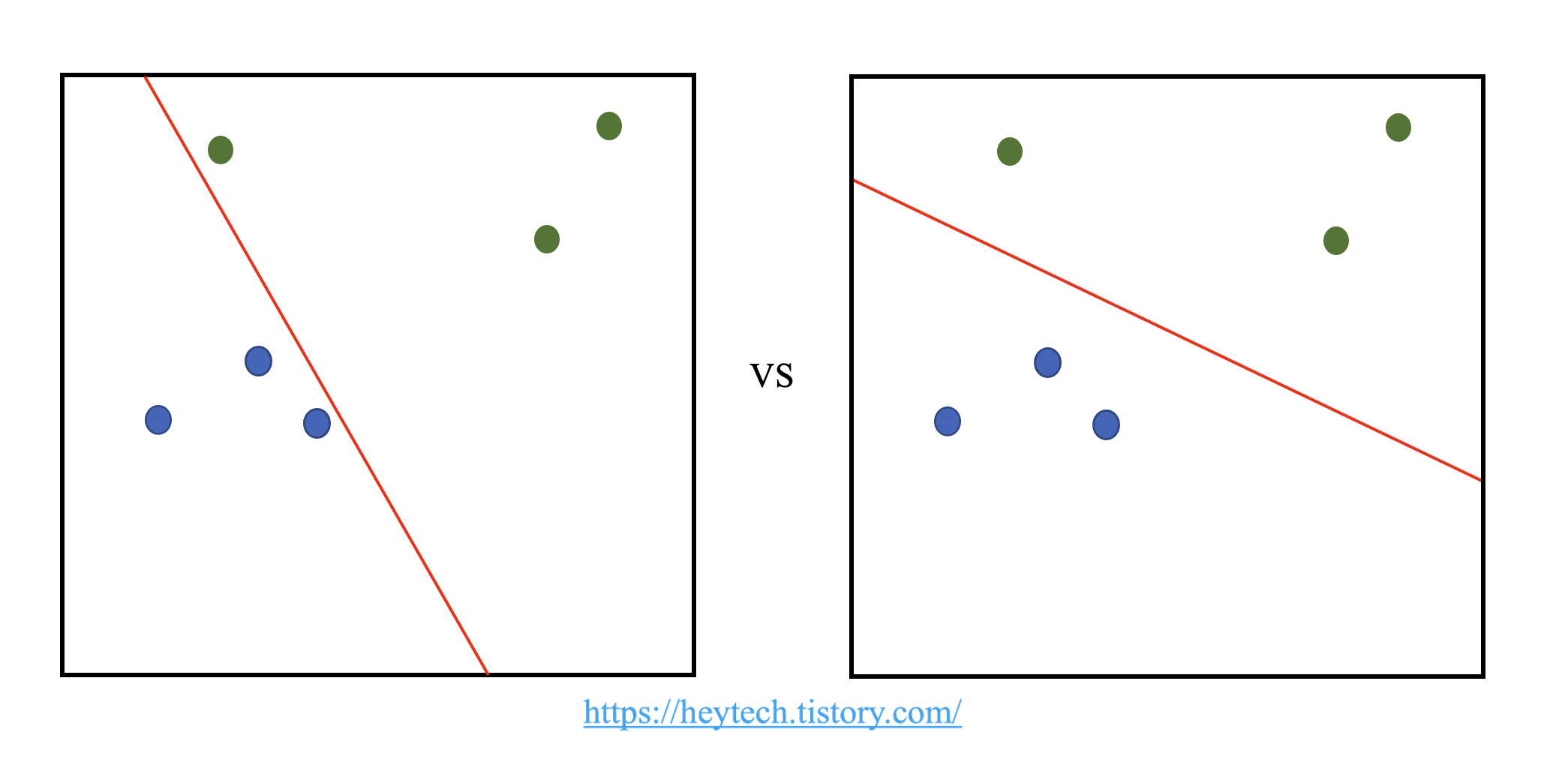 Sign 함수는 데이터와 결정경계(Decision Boundary) 간 거리 정보를 고려하지 않는 한계가 존재합니다. 그 이유에 대해 자세히 알아봅니다. 아래의 그림 3과 같이, 녹색과 파란색 동그라미 클래스가 있다고 가정해 보겠습니다. 두 클래스를 분류하는 기준이 되는 선을 결정경계(Decision Boundary)라고 부릅니다. 그림 3에서는 빨간색 직선이 이에 해당합니다. 그렇다면 좌측 그림과 우측 그림에서 어떤 결정경계가 더 좋다고 말할 수 있을까요?
