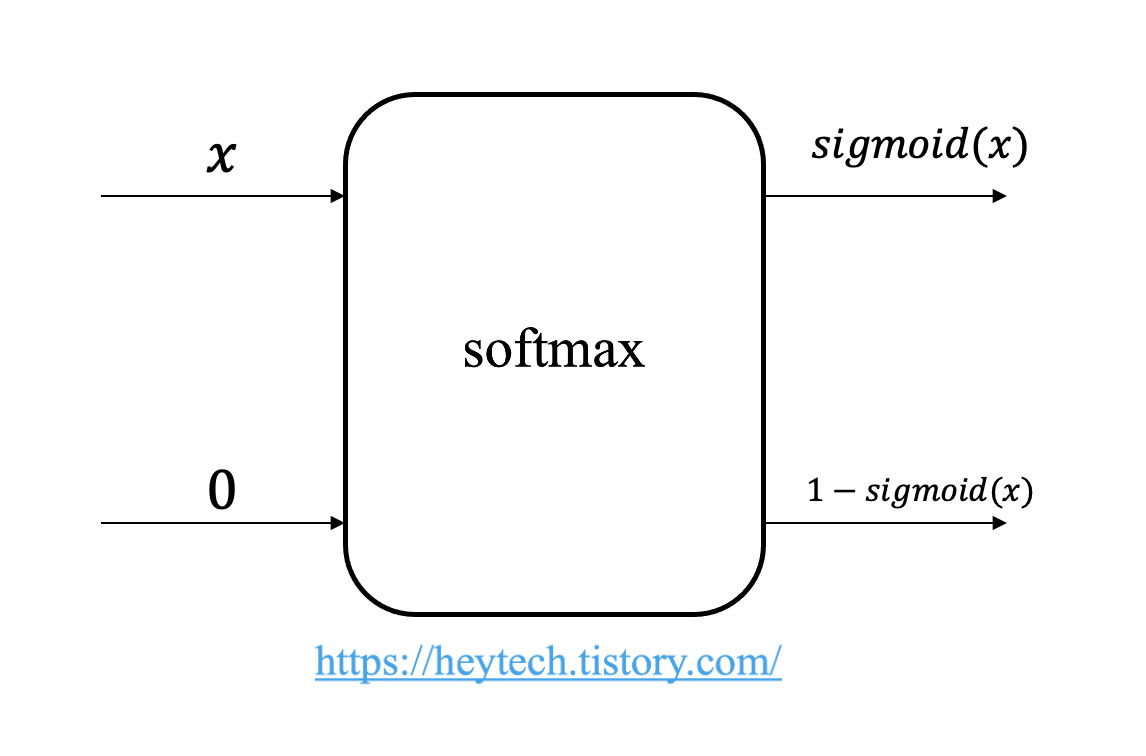 앞서 다룬 Sigmoid 함수는 하나의 입력을 \(0\)으로 고정한 2-Class Softmax(\(0\) 또는 \(sigmoid(x)\)) 함수와 동일합니다. 이를 쉽게 이해할 수 있도록 표현하면 아래의 그림 7과 같습니다.