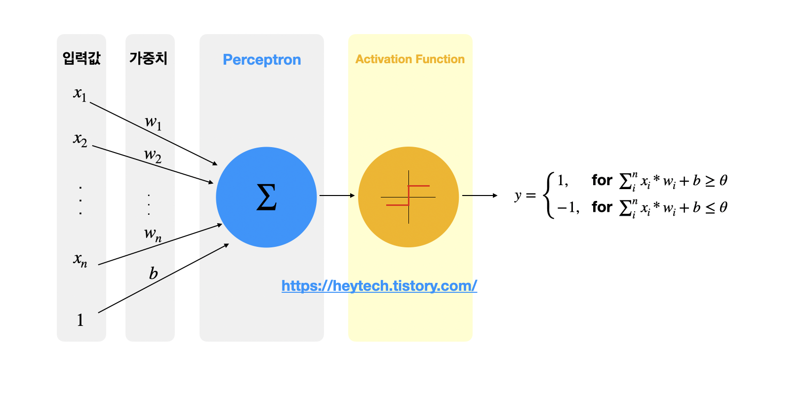 위의 퍼셉트론에서는 Sign 함수를 활성화 함수로써 활용하였습니다(그림 2 참고). 즉, Sign 함수의 활성화 함수는 퍼셉트론 내 입력값의 총합이 \(0\)보다 작을 경우 \(-1\)을 출력하고, 반대로 \(0\)보다 클 경우 \(1\)을 출력하는 역할을 합니다. 이처럼 활성화 함수는 비선형 함수입니다.