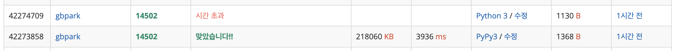 채점 결과, PyPy3로 채점했을 때는 통과했으나 Python3로 채점했을 때는 시간 초과가 나왔습니다. PyPy3가 Python3보다는 메모리를 많이 사용해도 속도 측면에서 빠르다 보니 이와 같은 결과가 나온 것으로 보입니다. Python3에서도 시간 초과 없이 문제를 풀기 위해 2번째 풀이를 시작하였습니다.
