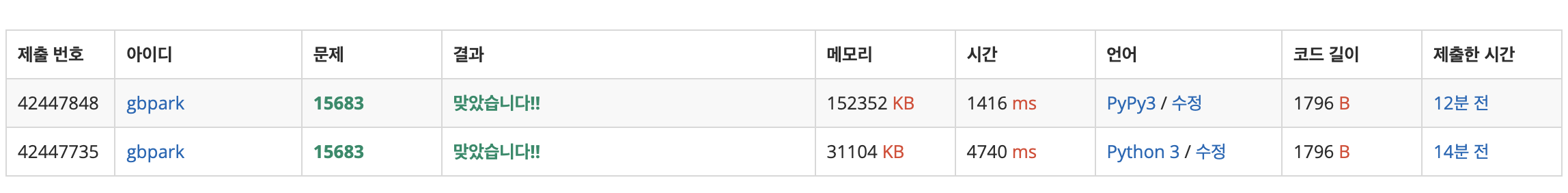 PyPy3와 Python3 모두에서 패스했습니다. 반복문과 같은 복잡한 연산이 많다보니 PyPy3가 Python3보다는 시간 복잡도에서 우세하네요.