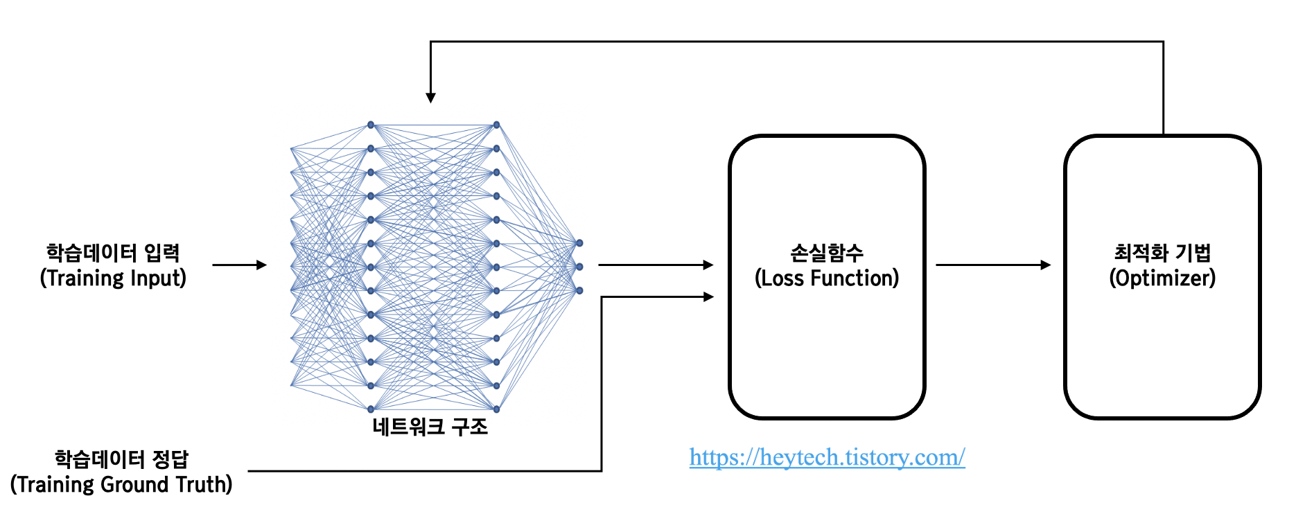 딥러닝 분야에서 최적화(Optimization)란 손실 함수(Loss Function) 값을 최소화하는 파라미터를 구하는 과정입니다(아래 그림 1 참고). 딥러닝에서는 학습 데이터를 입력하여 네트워크 구조를 거쳐 예측값(\(\hat{y}\))을 얻습니다. 이 예측값과 실제 정답(\(y\))과의 차이를 비교하는 함수가 손실 함수입니다. 즉, 모델이 예측한 값과 실젯값의 차이를 최소화하는 네트워크 구조의 파라미터(a.k.a., Feature)를 찾는 과정이 최적화입니다. 최적화 기법에는 여러 가지가 있으며, 본 포스팅에서는 경사 하강법(Gradient Descent)에 대해 알아봅니다.