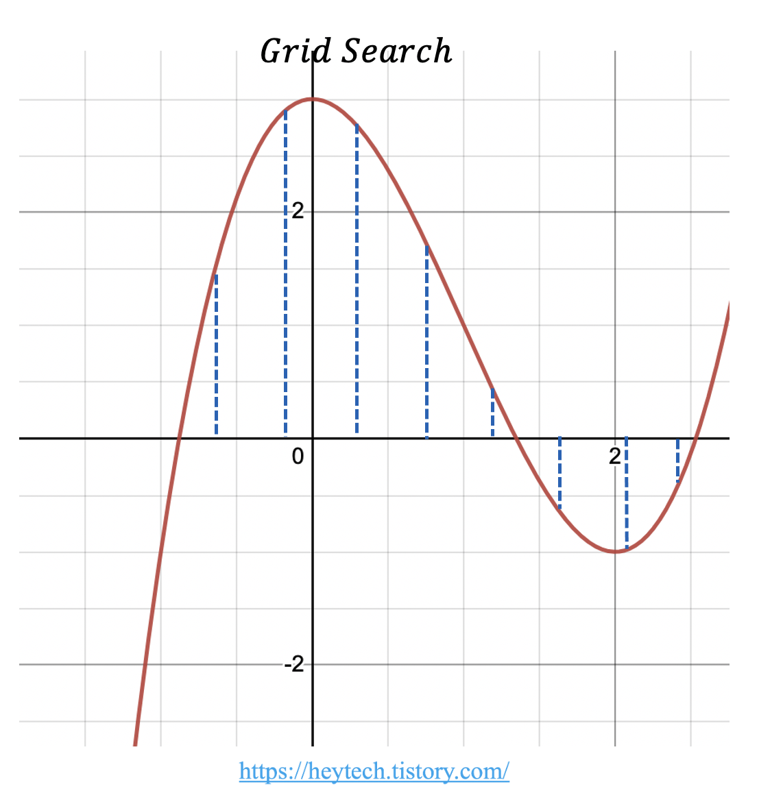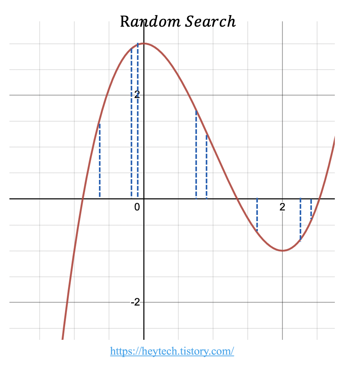 그리드 서치는 2가지 한계점이 있습니다. 첫째, 최적의 해를 찾을 수 있다는 보장이 없습니다. 위의 그림 1에서는 하이퍼파라미터가 0 근처에서 목표함수가 최댓값을 갖습니다. 하지만 목표함수 값을 탐색하는 파란색 점선이 최적의 해를 그냥 지나치는 것을 볼 수 있습니다. 이처럼 그리드 서치는 최적의 해를 찾지 못하는 경우가 생길 수 있습니다. 둘째, 동작 방식이 비효율적입니다. 지정한 모든 구간을 탐색해야 하기 때문에 굳이 탐색하지 않아도 되는 하이퍼파라미터 값에 대해서도 탐색하는 경우가 생깁니다. 예를 들어, 위의 그림 1에서 아래로 볼록인 구간은 사실상 출력이 음수이기 때문에 최댓값을 구하는 문제에서는 탐색할 필요가 없는 구간입니다. 하지만, 그리드 서치는 이러한 구간까지 탐색하기 때문에 탐색 과정이 비효율적이라고 할 수 있습니다.
