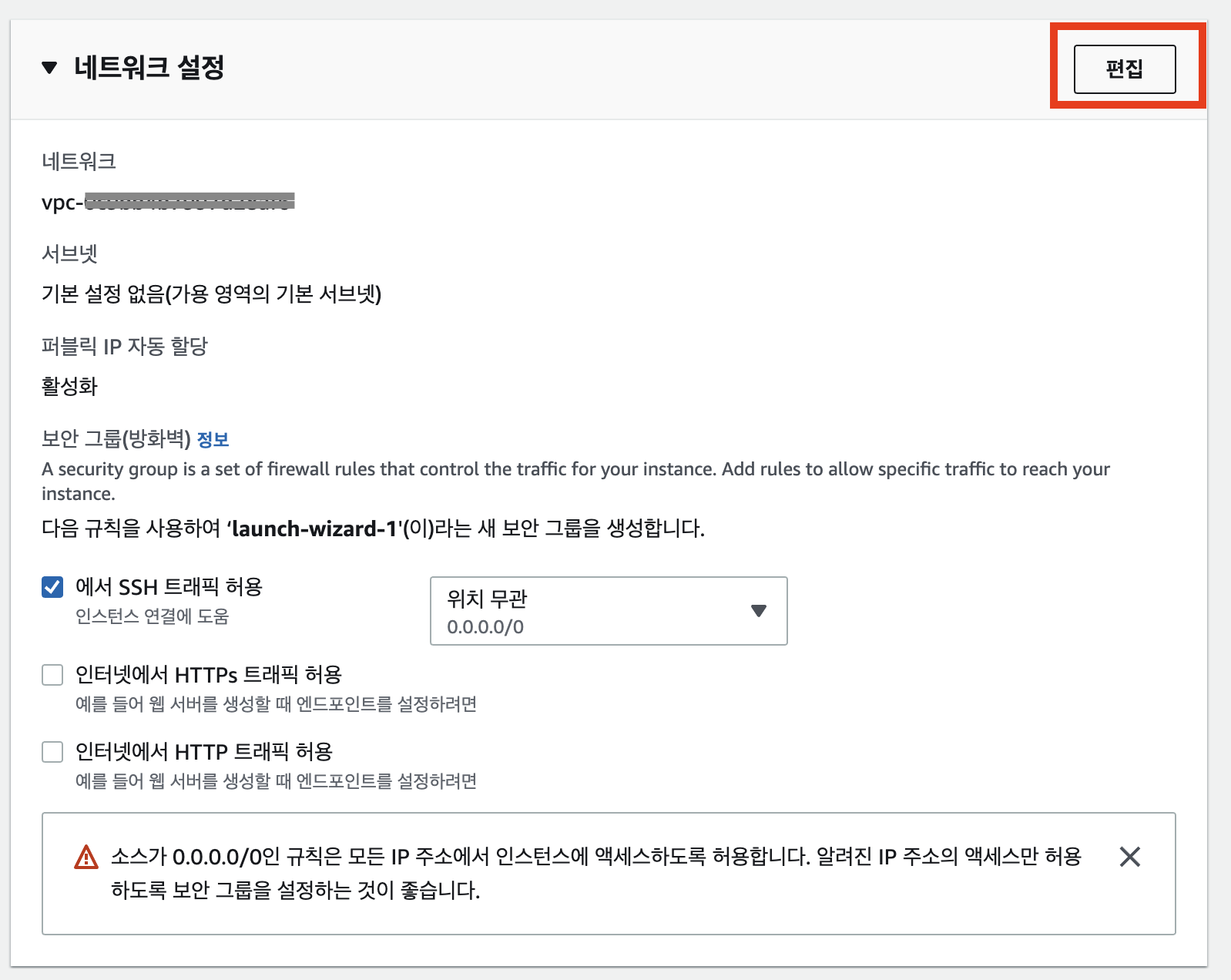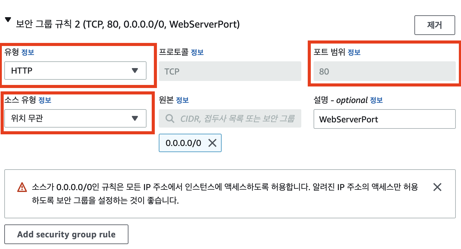 ๋ณด์ ๊ทธ๋ฃน ์ด๋ฆ์ ์ ๋ ฅํด ์ค๋๋ค. 22๋ฒ ํฌํธ๋ SSH ํต์ ์ ์ํด ๊ธฐ๋ณธ์ ์ผ๋ก ์ด๋ ค ์์ต๋๋ค. [์์ค ์ ํ]์ IP๋ณ ์ ๊ทผ ๊ถํ์ ์์ ํ ์ ์์ต๋๋ค. ์ด๋์๋ SSH ์ ๊ทผ์ ์ํด [์์น ๋ฌด๊ด]์ผ๋ก ์ธํ ๋์ด ์์ต๋๋ค. ๋ฐ๋ก ์ถ๊ฐ์ ์ผ๋ก ์์ ํ ๊ฒ ์์ด ์๋์ [Add security group rule] ๋ฒํผ์ ํด๋ฆญํด ์ฃผ์ธ์.
