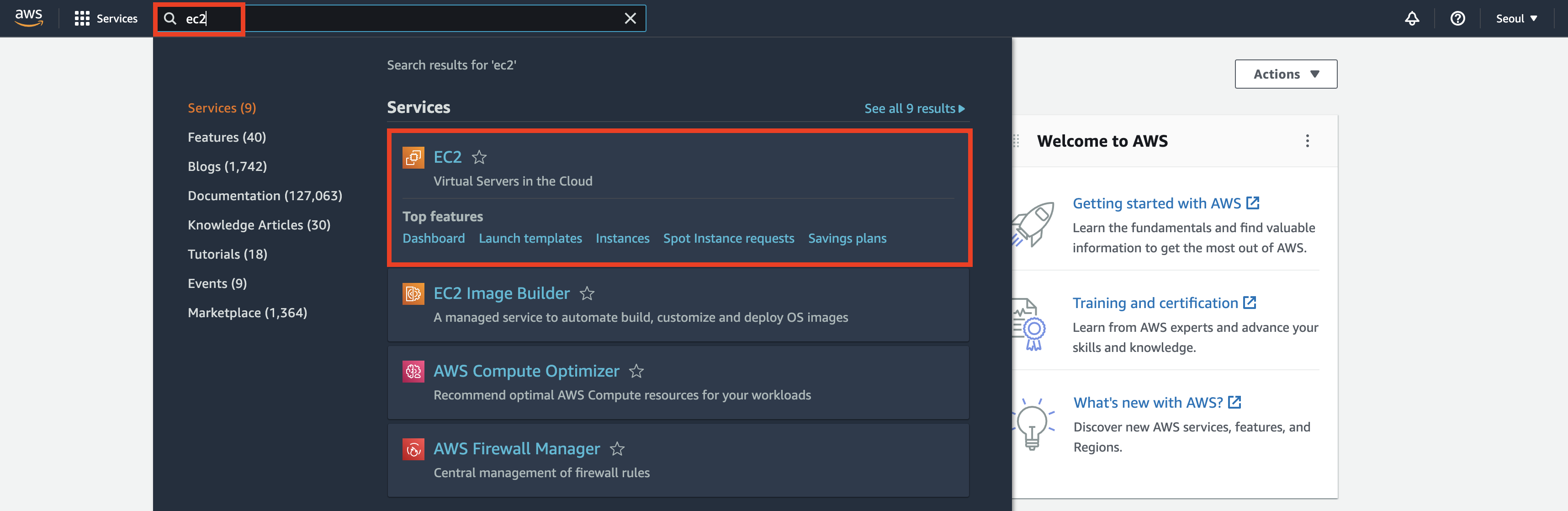 ์๋์ ๊ทธ๋ฆผ 5์ฒ๋ผ AWS ํํ์ด์ง ์๋จ ๊ฒ์์ฐฝ์ ec2๋ฅผ ์ ๋ ฅํ๊ณ , ๊ฒ์ ๊ฒฐ๊ณผ ๋ด EC2 ์๋น์ค๋ฅผ ํด๋ฆญํฉ๋๋ค.