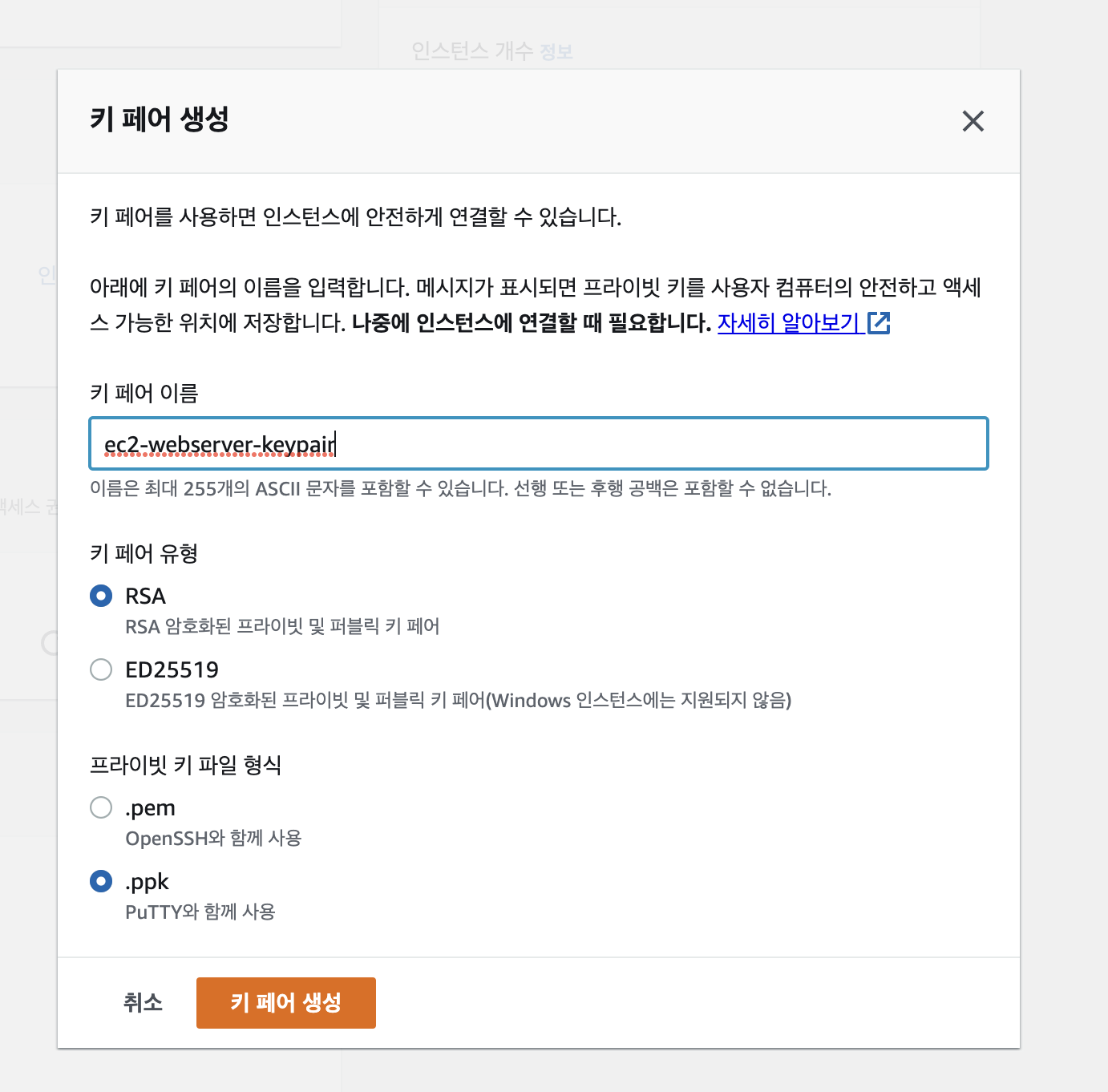 ์๋์ ๊ทธ๋ฆผ 10๊ณผ ๊ฐ์ด ํค ํ์ด ์์ฑ ์ฐฝ์ด ๋์ค๋ฉด ํค ํ์ด ์ด๋ฆ์ ์ ๋ ฅํด ์ฃผ์ธ์. ์ ๋ ์ถํ์ PuTTY ํ๋ก๊ทธ๋จ์ ํ์ฉํ์ฌ ํด๋น ์ธ์คํด์ค๋ฅผ ์๊ฒฉ ์ ์ดํ ์์ ์ด๊ธฐ ๋๋ฌธ์ ํ๋ผ์ด๋น ํค ํ์ผ ํ์์ ppk๋ก ์ ํํ์์ต๋๋ค.