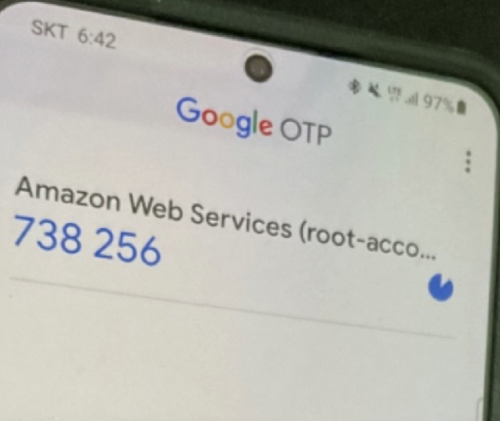 AWS์ ๋๊ธฐํํ ์ค๋งํธํฐ์ด๋ ํ๋ธ๋ฆฟ ๋ด ๊ตฌ๊ธ OTP ์ฑ์์ 1๋ถ ๋จ์๋ก ์๋ก์ด ์ํธ 6์๋ฆฌ๋ฅผ ์ป์ ์ ์์ต๋๋ค(๊ทธ๋ฆผ 5). AWS ์ฝ์ ๋ก๊ทธ์ธ ์ ๊ณ์ ๋น๋ฐ๋ฒํธ ์ ๋ ฅ ํ ๊ฐ์ MFA ๋๋ฐ์ด์ค๋ฅผ ํตํด ์ป์ ์ํธ๋ฅผ ์ ๋ ฅํด์ผ๋ง ์ ์์ ์ผ๋ก ๋ก๊ทธ์ธ์ด ๋ฉ๋๋ค.