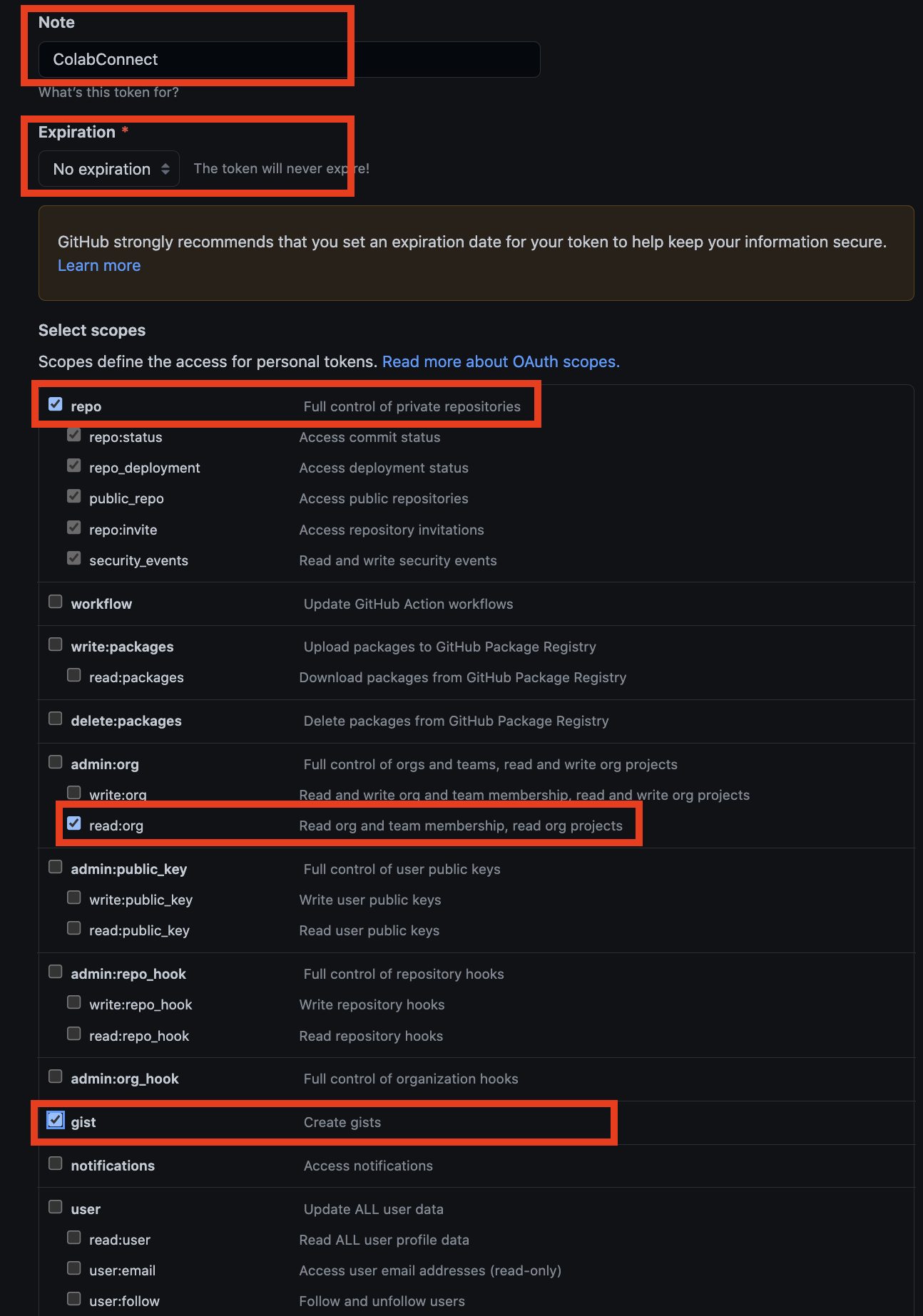 ์๋ ๊ทธ๋ฆผ 5์ ๊ฐ์ด ๊ฐ๋จํ ์ค๋ช ๋ฌธ(Note) ์์ฑ๊ณผ ํ ํฐ ๋ง๋ฃ์ผ(Expiration)์ ์ ํํ๊ณ scope ์ญ์ ๊ทธ๋ฆผ์ ์ฐธ๊ณ ํ์ฌ ์ ํํ ํ, ๋งจ ์๋์ ๋ น์ ๋ฒํผ์ ํด๋ฆญํ์ฌ ํ ํฐ์ ์์ฑํฉ๋๋ค.
