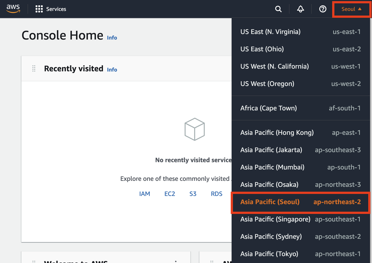 ํ์๊ฐ์ ๊น์ง ์๋ฃํ์ จ๋ค๋ฉด ํ์ฌ PC๋ฅผ ์ฌ์ฉ ์ค์ธ ์ง์ญ๊ณผ ๊ฐ์ฅ ๊ฐ๊น์ด ๊ฑฐ๋ฆฌ์ ์๋ ์๋น์ค ์ง์ญ(Region)์ ์ ํํ์ ์ผ ํฉ๋๋ค. ์ถํ์ ์๋น์ค ์๊ธ์ ๋ํด ์ดํด๋ณด๊ฒ ์ง๋ง, ์๋น์ค ์ง์ญ๋ง๋ค ๊ณผ๊ธ์ด ๋ค๋ฅด๊ธฐ ๋๋ฌธ์ ๋๋ค. ์๋์ ๊ทธ๋ฆผ 2์ฒ๋ผ, AWS ํํ์ด์ง ์ฐ์ธก ์๋จ์ ์ง์ญ ์ด๋ฆ์ ํด๋ฆญํ๋ฉด ์๋น์ค ์ง์ญ์ ๋ณ๊ฒฝํ์ค ์ ์์ต๋๋ค. ๋ํ๋ฏผ๊ตญ์ ๊ฑฐ์ฃผํ๊ณ ๊ณ์๋ค๋ฉด Seoul์ ์ ํํด ์ฃผ๋ฉด ๋ฉ๋๋ค.