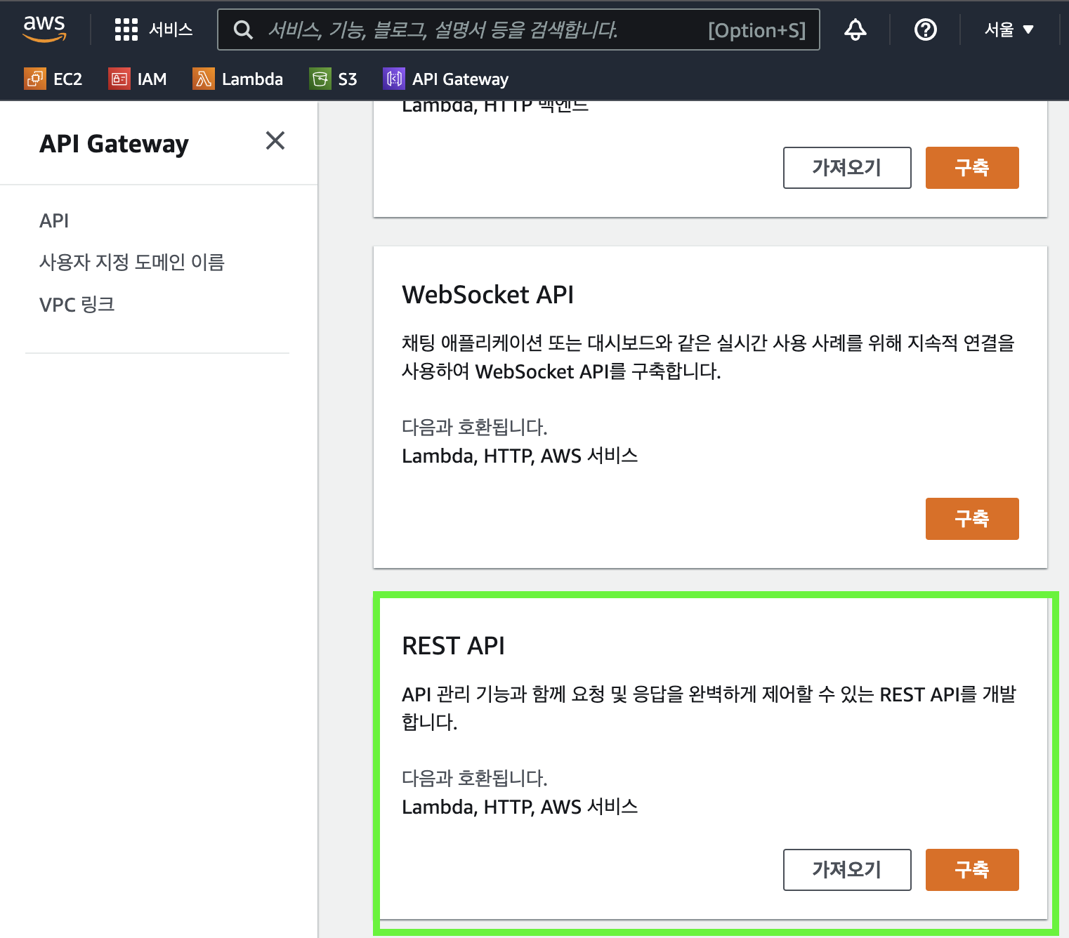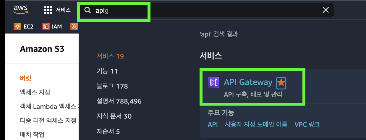 ๋จผ์ AWS ํํ์ด์ง ๋ด ๊ฒ์์ฐฝ์์ API Gateway๋ฅผ ๊ฒ์ํ์ฌ ํด๋น ์ฝ์๋ก ์ ๊ทผํฉ๋๋ค(๊ทธ๋ฆผ 1).