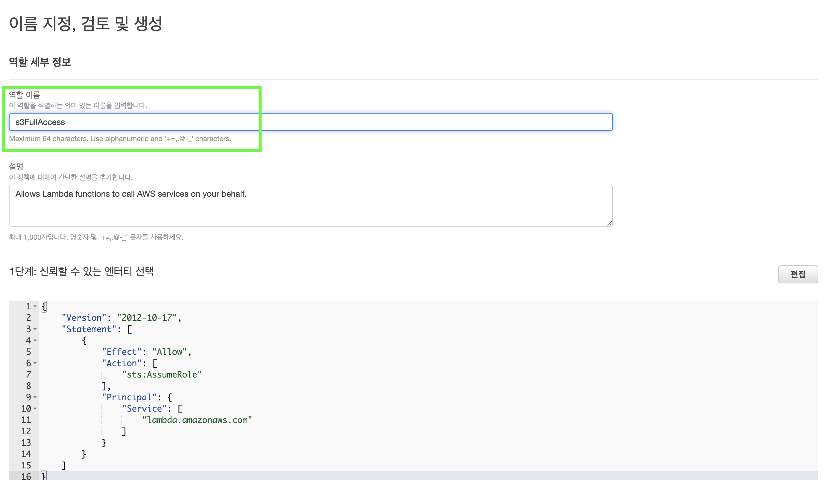 ๊ถํ ์ ์ฑ ๊ฒ์์ฐฝ์ S3๋ฅผ ์ ๋ ฅํ ํ ์๋์ AmazonS3FullAccess๋ฅผ ์ฒดํฌํฉ๋๋ค(๊ทธ๋ฆผ 9). ์ ๋ก๋ํ ํ์ผ์ ์ ์ฅํ๋ ์๋น์ค(S3)์ ๋ํ ๋ชจ๋ ์ก์ธ์ค ๊ถํ์ ๋ถ์ฌํ๋ ๊ฒ์ ๋๋ค.