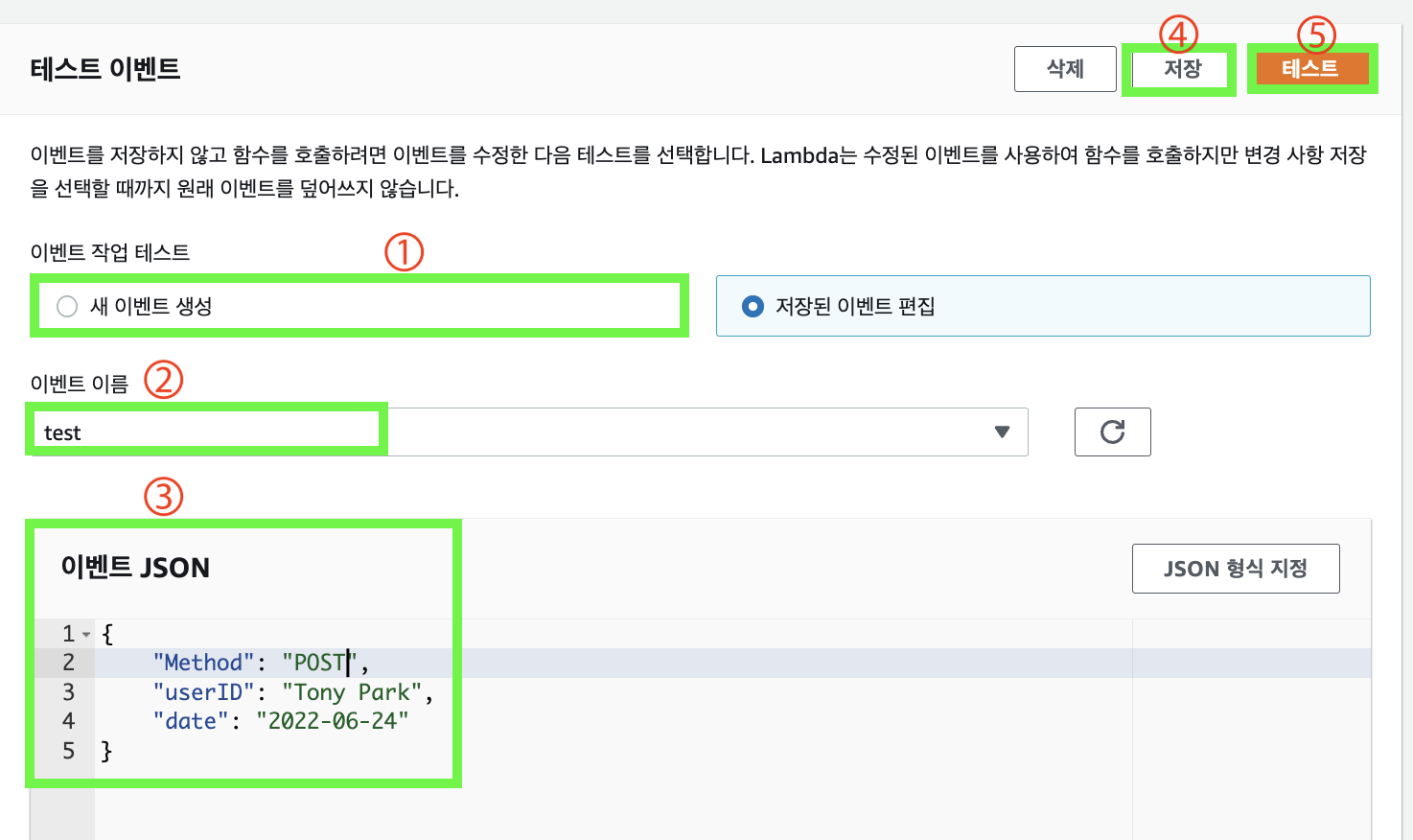 ๊ฐ๋จํ ํ ์คํธ๋ฅผ ์ํด Lambda ์ฝ์์์ ์๋์ ๊ทธ๋ฆผ 13์ฒ๋ผ, "ํ ์คํธ" ํญ์ผ๋ก ์ด๋ํฉ๋๋ค.