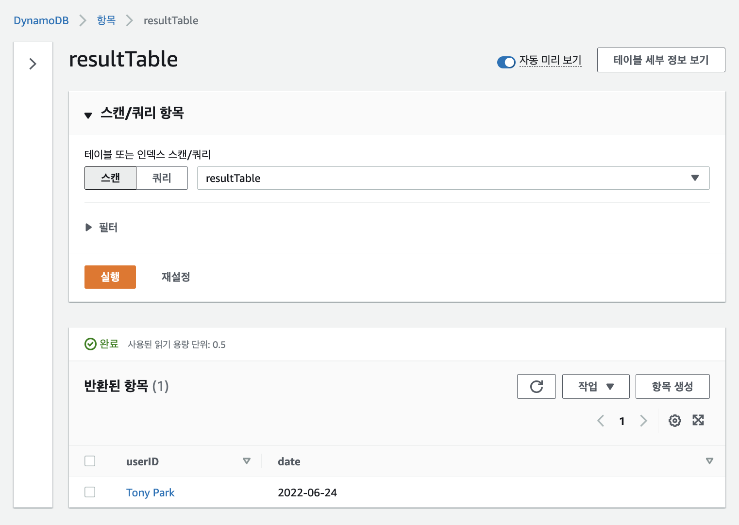 ์๋ ๊ทธ๋ฆผ 16๊ณผ ๊ฐ์ด ์ค์ ๋ก DynamoDB ํ ์ด๋ธ์ ๋ฐ์ดํฐ๊ฐ ์ ์ฝ์ ๋ ๊ฒ์ ํ์ธํ์ค ์ ์์ต๋๋ค.