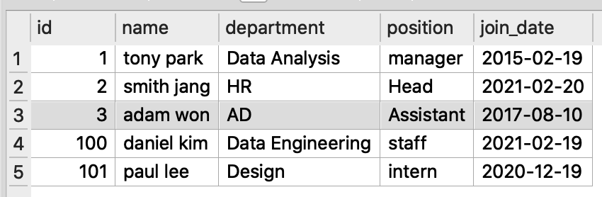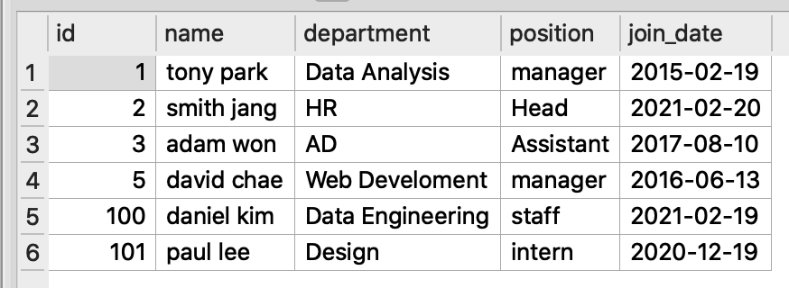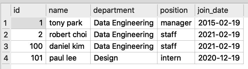 employee 테이블은 아래 그림 1 과 같이 직원id(primary key + auto increment), 직원명, 부서명, 직급, 입사일 정보를 담고 있습니다.