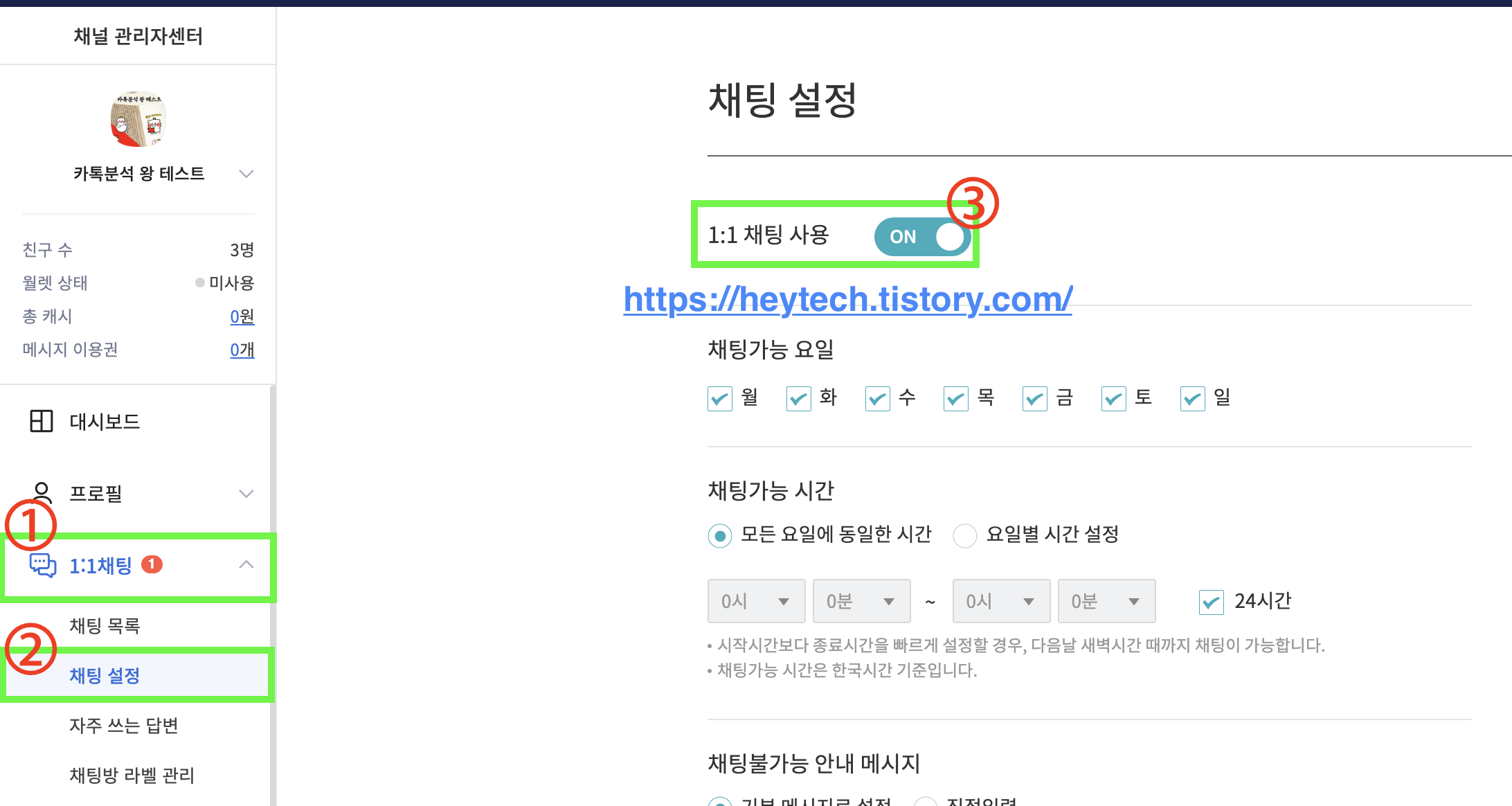 ์นดํก ํ์น๊ณผ ์ฑํ ์ด ๋ฐ๋ก ์ฐ๊ฒฐ ์ ๋ ๊ฒฝ์ฐ, 1:1 ์ฑํ ์ด ๋นํ์ฑํ๋์ด ์๊ธฐ ๋๋ฌธ์ผ ํ๋ฅ ์ด ๋์ต๋๋ค. ์๋์ ๊ทธ๋ฆผ 6๊ณผ ๊ฐ์ด, ์นดํก ํ์น ์น ํ์ด์ง์์ 1:1 ์ฑํ ์ ํ์ฑํํด ์ฃผ์ธ์.