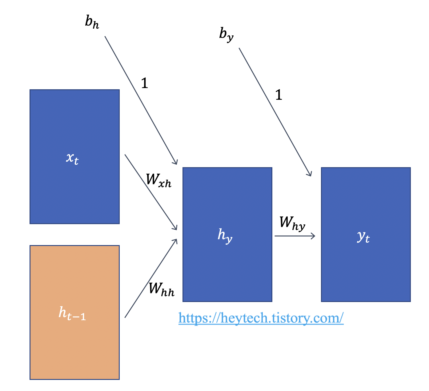 - \(h_{t-1}\): \((t-1)\)번째 time step에서의 Hidden State