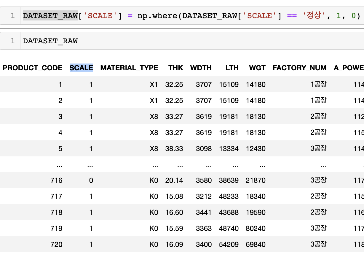 DATASET_RAW['SCALE'] = np.where(DATASET_RAW['SCALE'] == '정상', 1, 0)
