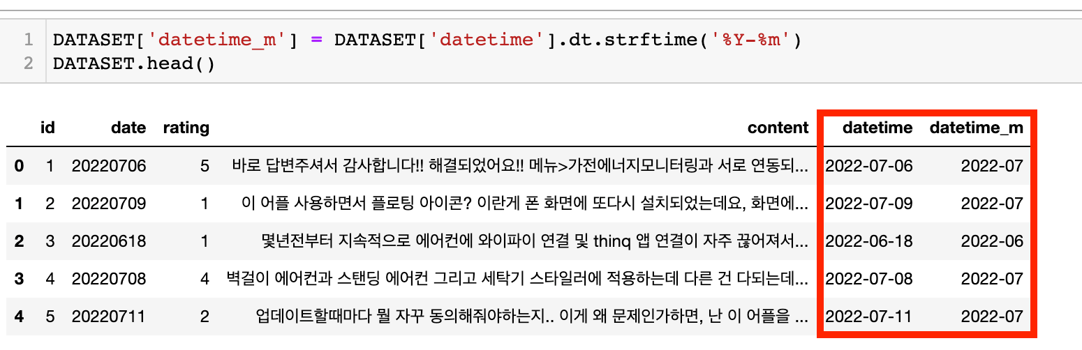 dt.strftime 함수에, format으로 '%Y-%m'만 입력하면 아래의 그림 2와 같이 연도와 월 데이터만 추출됩니다.
