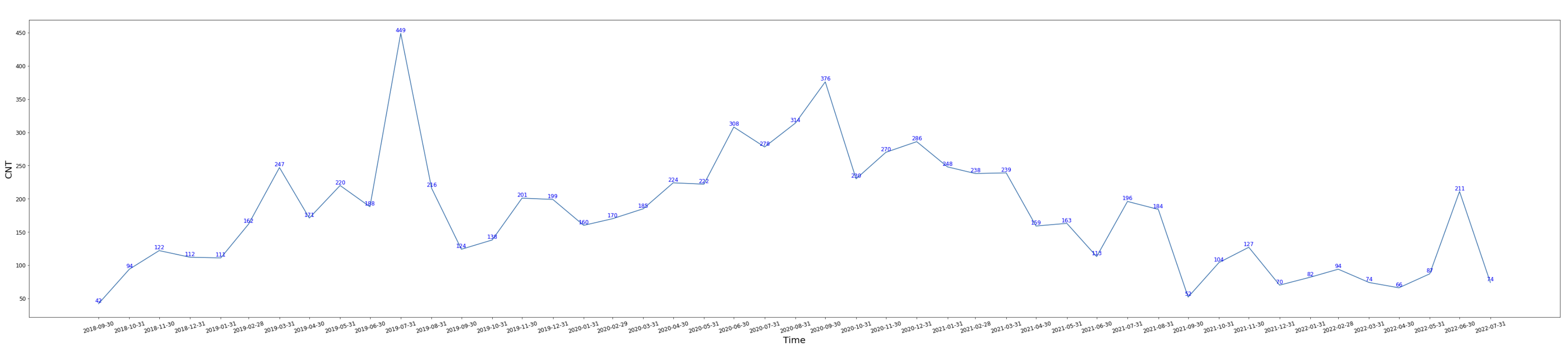 resample 함수에 옵션 'M'을 설정하고 CNT 칼럼을 합계하여 월 단위로 데이터 개수를 카운트합니다.