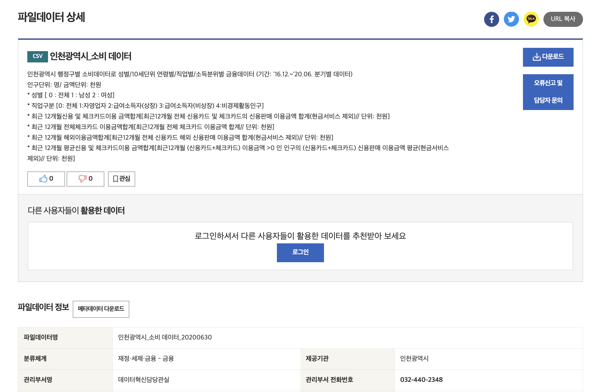 학습 목적으로 공공 데이터를 다운로드 합니다. 로그인 필요 없습니다. 저는 아래 링크의 인천시 소비 데이터를 받아봤습니다.