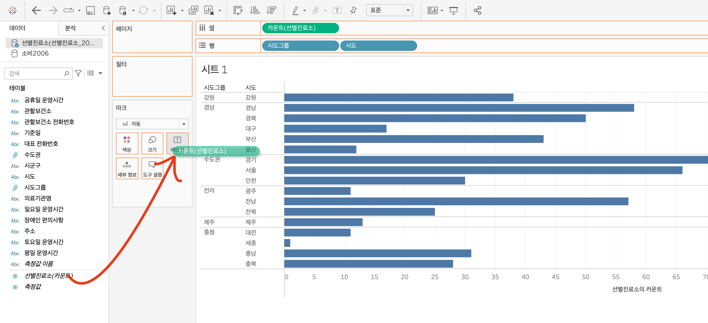 레이블 표현 방법은 매우 간단합니다. 원하는 필드를 아래의 그림 2와 같이 '마크' 내 '레이블'에 드래그 앤 드롭하면 됩니다.